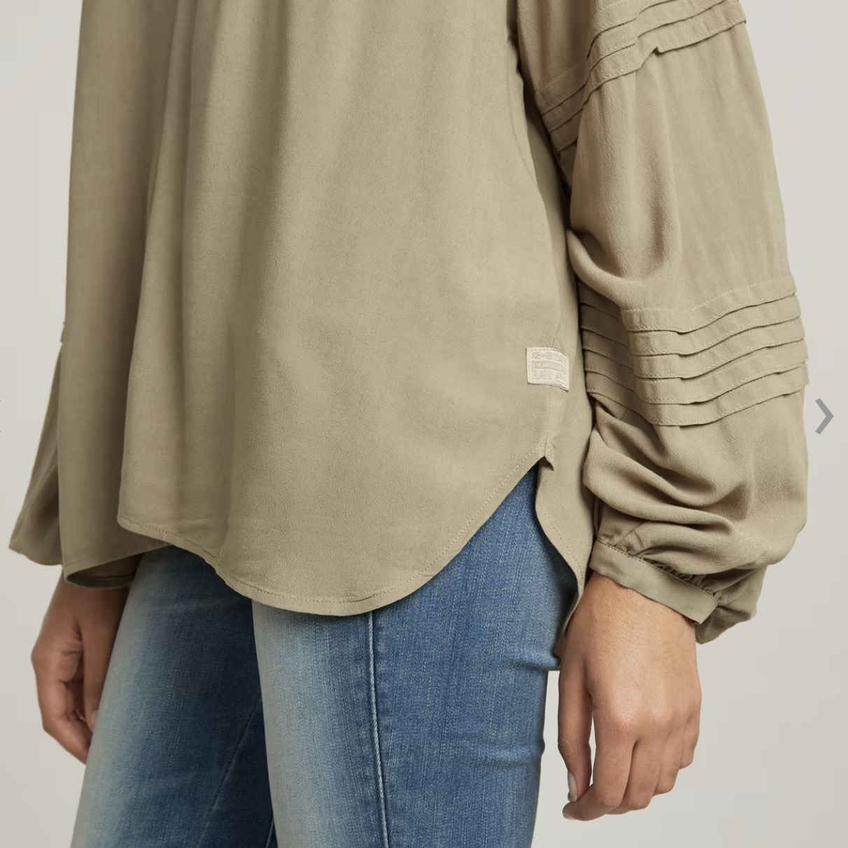 Elementul central al designului este decolteul rotund prevăzut cu o cusătură adunată și o fantă frontală discretă, ce poate fi reglată după preferințe cu ajutorul șnururilor delicate. Mânecile sunt lungi și voluminoase, prezentând detalii sofisticate de pliuri orizontale (folded pleats), fiind finisate cu manșete elastice ce subliniază aspectul de „mânecă bufantă”. Culoarea Shadow Olive (kaki) adaugă o notă de eleganță sobră, făcând din acest top o piesă extrem de versatilă, ușor de asortat cu jeanși sau pantaloni de stofă.