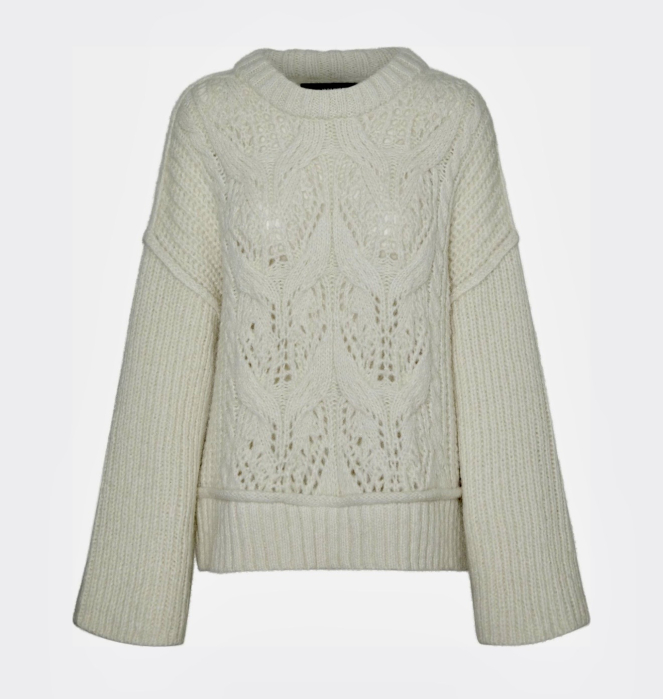 Designul se remarcă prin modelul cu găuri (hole pattern) și torsade intricate, care adaugă o textură vizuală bogată și un aer sofisticat. Croiala este una normală (normal fit), cu umeri ușor căzuți (overcut shoulders) și guler rotund clasic, asigurând o potrivire confortabilă și relaxată.