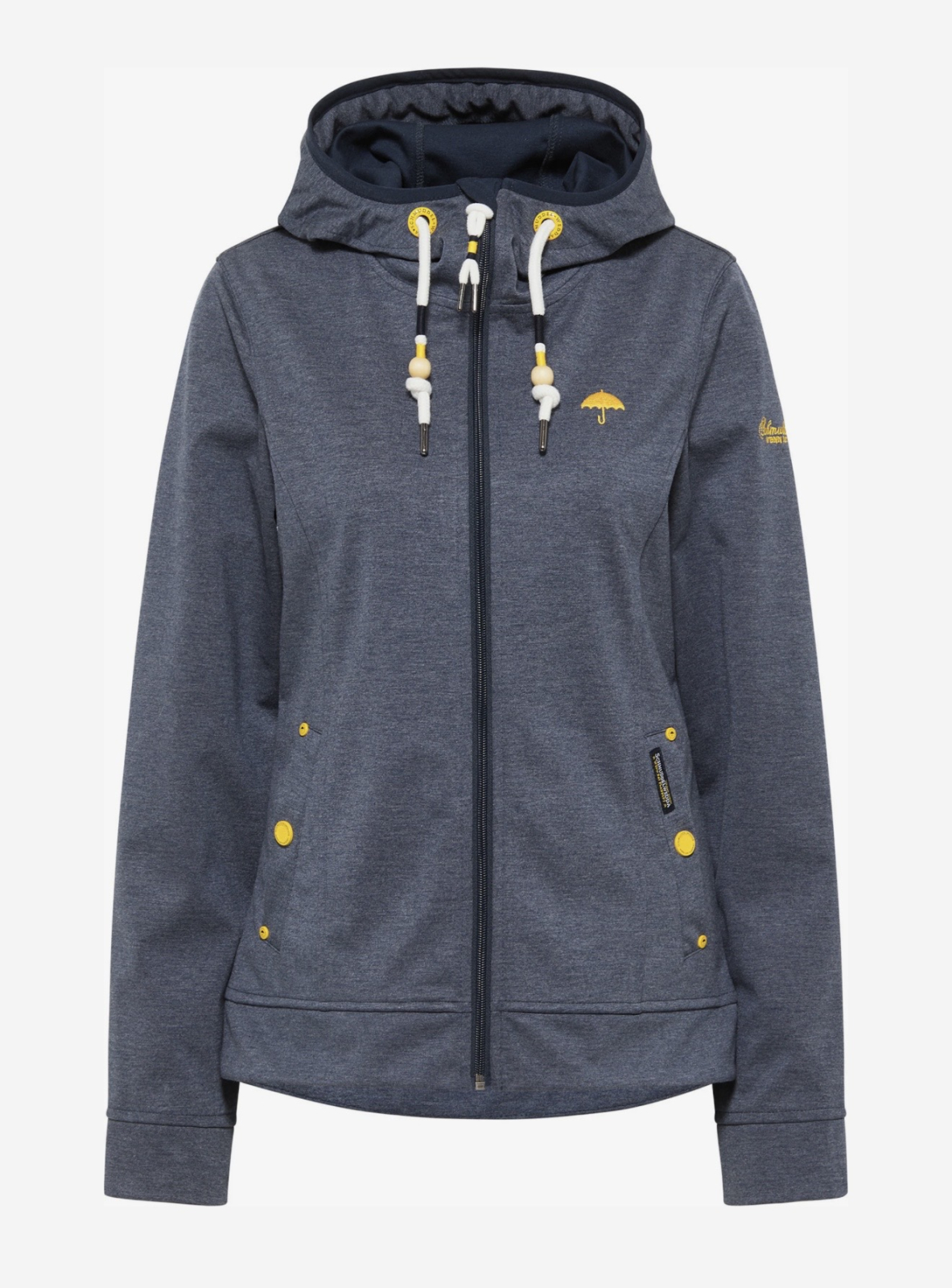 Designul este bogat în detalii funcționale și estetice specifice brandului, incluzând o glugă generoasă reglabilă cu șnururi groase și ochiuri metalice gravate. Elementele de contrast în galben vibrant, precum nasturii decorativi, capsele de pe buzunarele laterale și logo-ul iconic cu umbrelă brodat pe piept, oferă un accent vizual plăcut și recunoaștere instantanee a brandului. Sistemul de închidere cu fermoar continuu și croiala mulată completează silueta, făcând din această geacă partenerul ideal pentru plimbările în aer liber sau pentru utilizarea zilnică în mediul urban.