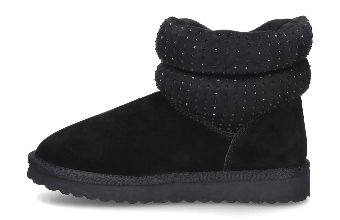 Acest model este construit pe o bază solidă din piele naturală întoarsă de culoare negru intens, oferind o rezistență sporită și un aspect mat, catifelat. Elementul central de design este bordura matlasată din partea superioară, care este decorată generos cu strasuri negre aplicate manual, ce captează lumina într-un mod subtil și elegant. Croiala joasă, de tip botină, facilitează încălțarea rapidă, fiind ideală pentru ținutele urbane dinamice.