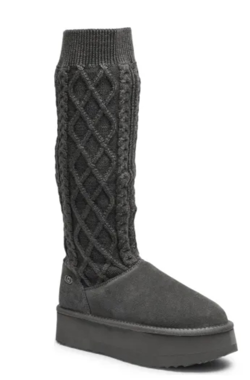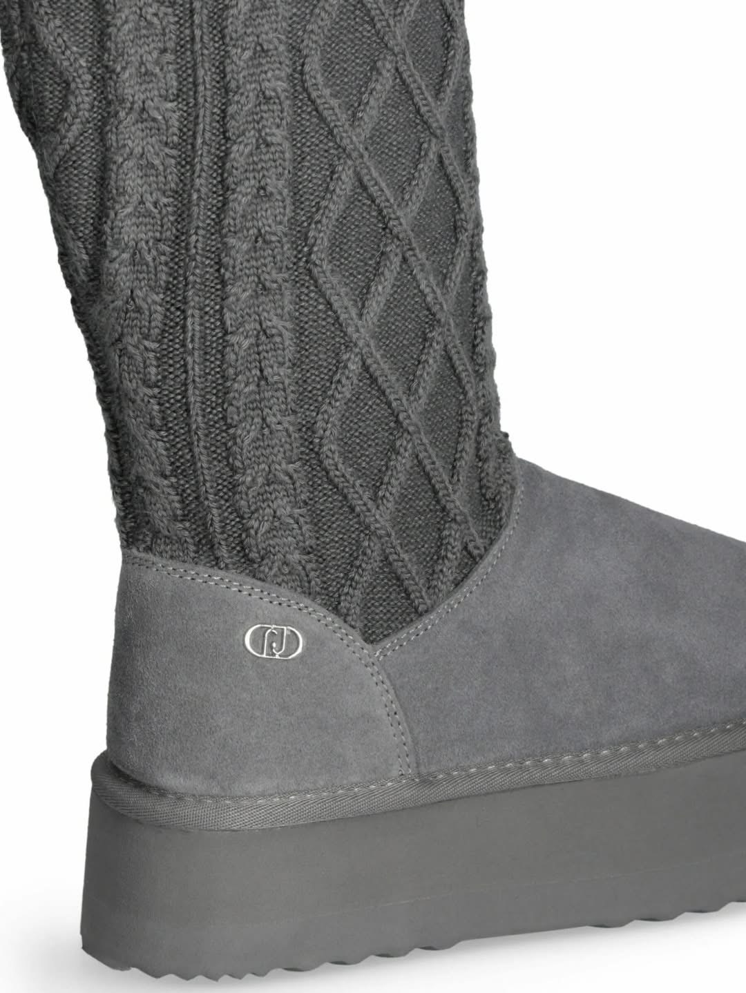 Acest model se remarcă printr-un design hibrid, unde partea inferioară este confecționată din piele naturală întoarsă de calitate superioară, oferind o structură solidă și un aspect rafinat. Partea superioară este realizată dintr-un material textil tricotat cu model tip torsade, care nu doar adaugă o notă feminină și confortabilă, dar permite și o mulare perfectă pe gambă.