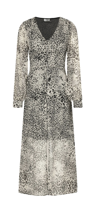 Designul se remarcă prin croiala regular fit și imprimeul animal print integral în nuanțe de ecru (alb-crem) și negru, care include detalii grafice subtile cu capete de leopard pentru un plus de originalitate. Decolteul în V adaugă o notă senzuală, iar mânecile lungi, cu efect de transparență, completează look-ul sofisticat. Această rochie este căptușită, asigurând discreția necesară, fiind o alegere ideală pentru a ieși în evidență