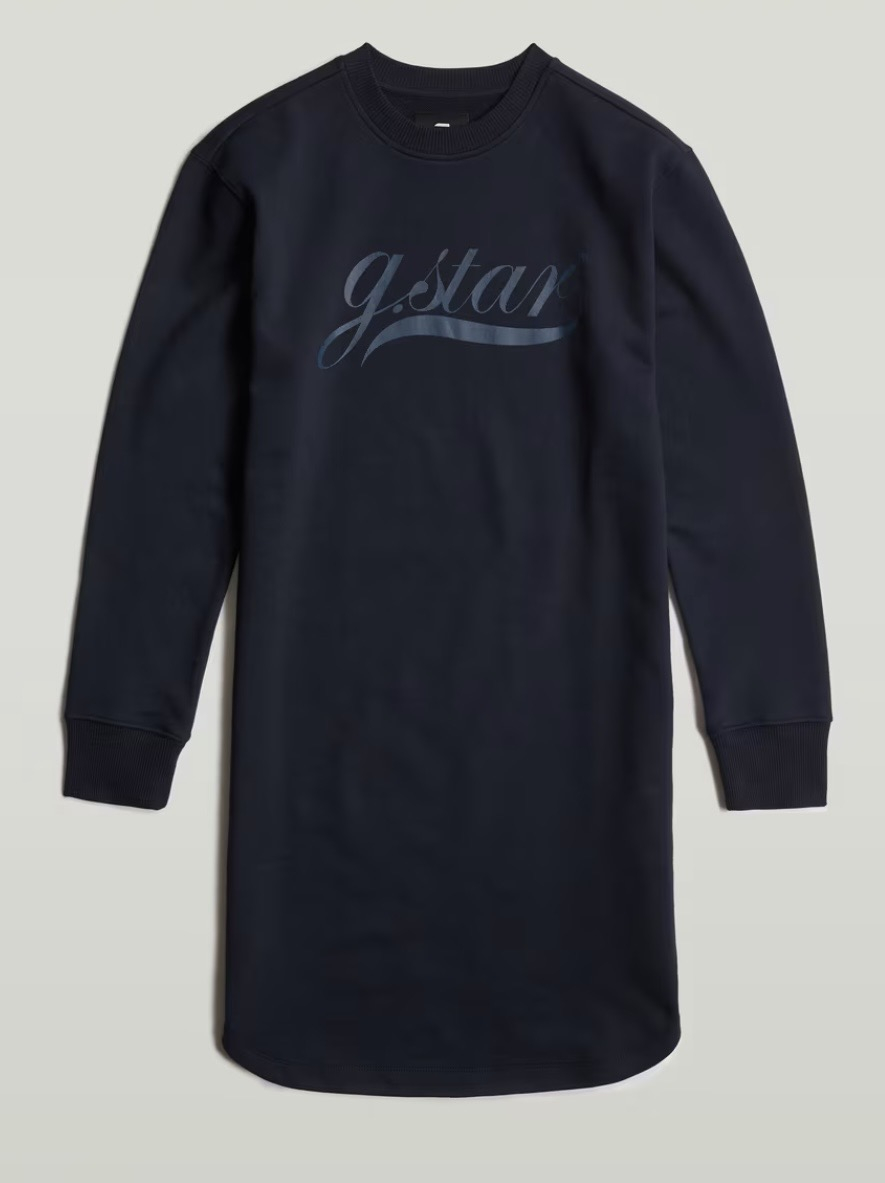 Rochia tip hanorac de la G-Star Raw reprezintă piesa centrală ideală pentru o garderobă streetwear feminină și relaxată. Acest model se distinge prin croiala sa de tip oversized și finisajul cu o linie a spatelui ușor prelungită, oferind o siluetă modernă și o libertate de mișcare deplină. Punctul focal al designului este grafica de pe piept, un imprimeu „flock” cu logo-ul brandului realizat într-o textură catifelată, care adaugă un plus de sofisticare culorii de bază albastru închis.