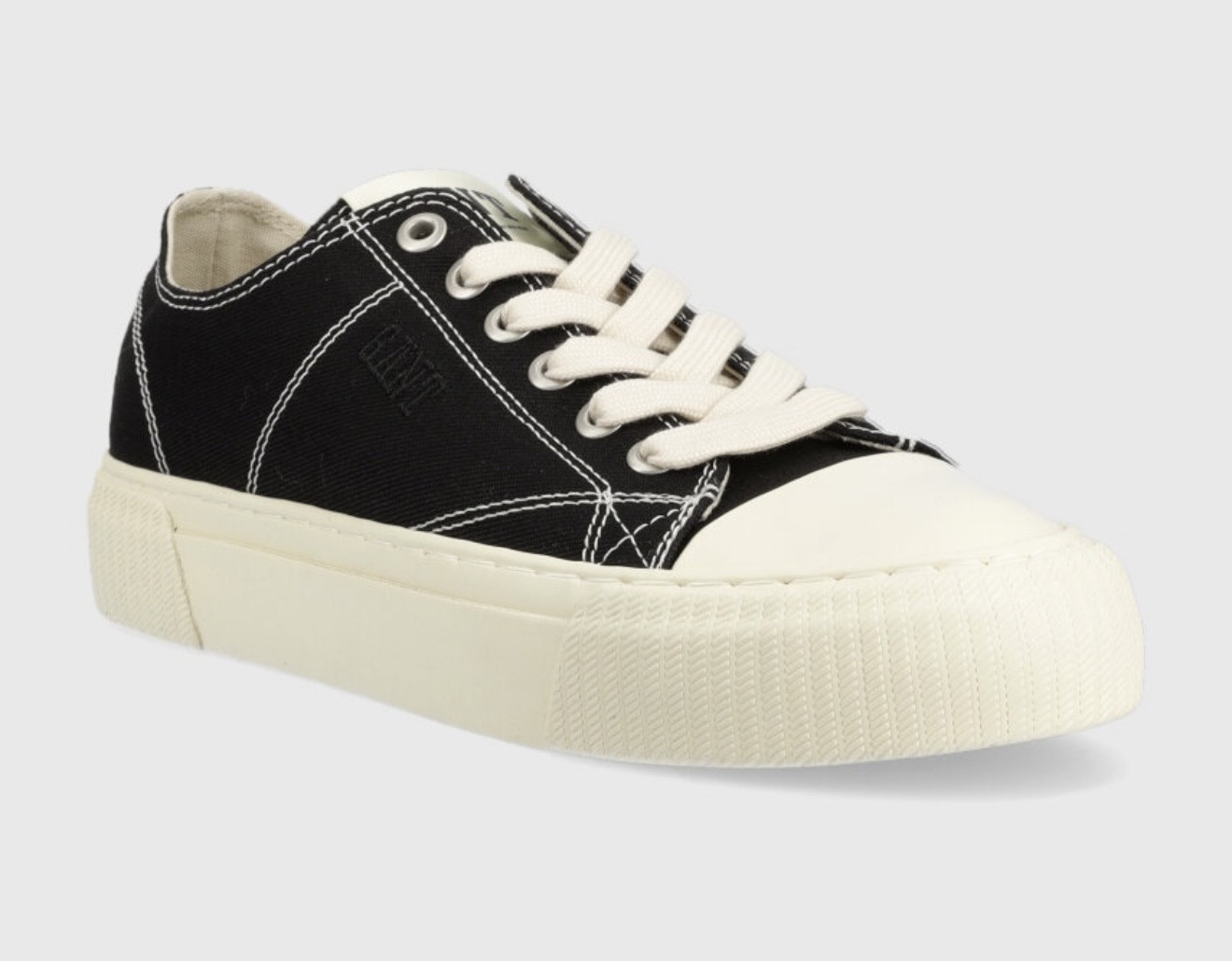 Exteriorul este realizat dintr-un material textil de tip canvas, extrem de rezistent și flexibil, care permite o ventilație optimă a piciorului pe tot parcursul purtării. Contrastul vizual puternic între negrul profund al pânzei și albul curat al tălpii și al cusăturilor decorative oferă un aspect grafic modern. Vârful este prevăzut cu o protecție din cauciuc, element care nu doar adaugă un plus de stil retro, ci și sporește rezistența la uzură.